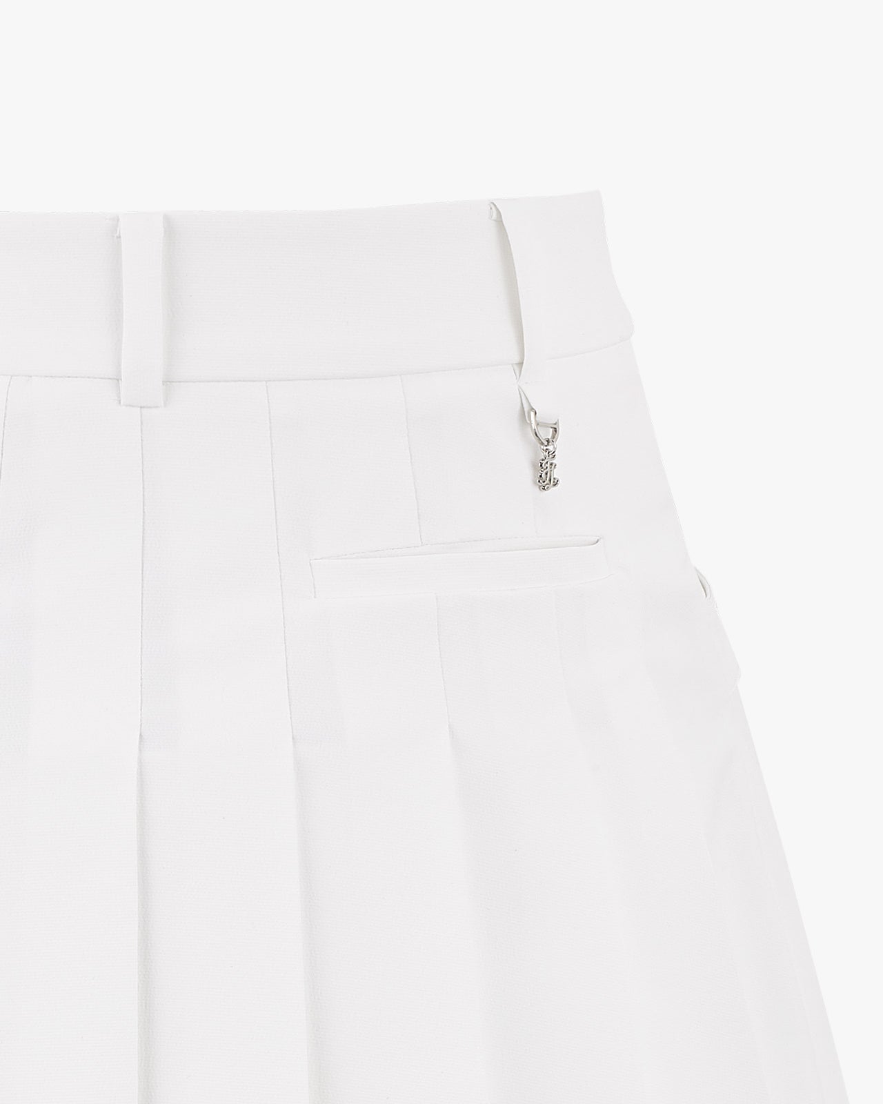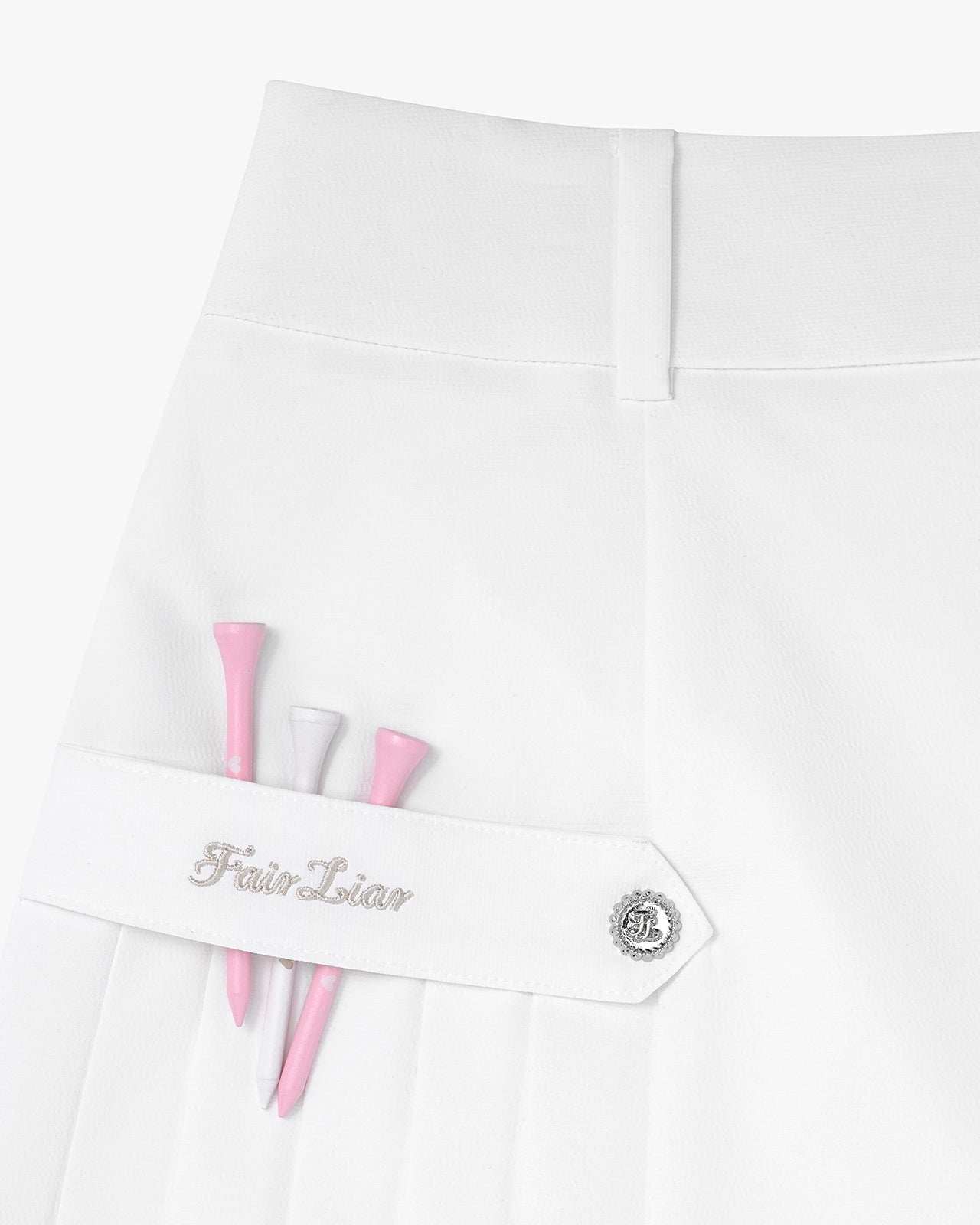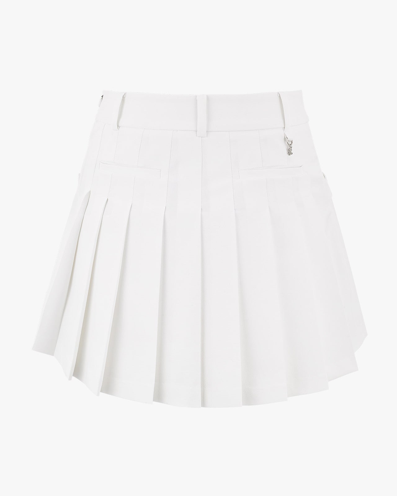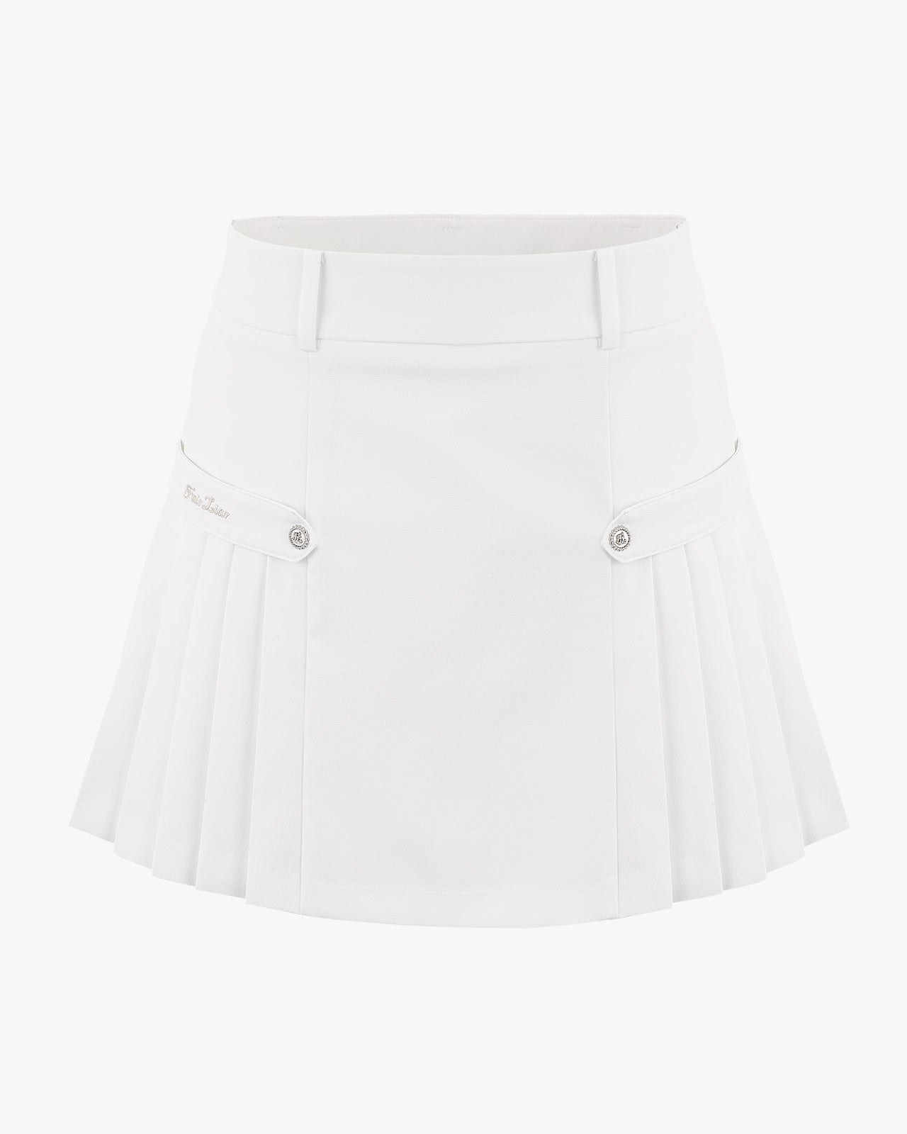 ブランドロゴ入りスナップ飾りのAラインプリーツスカート。