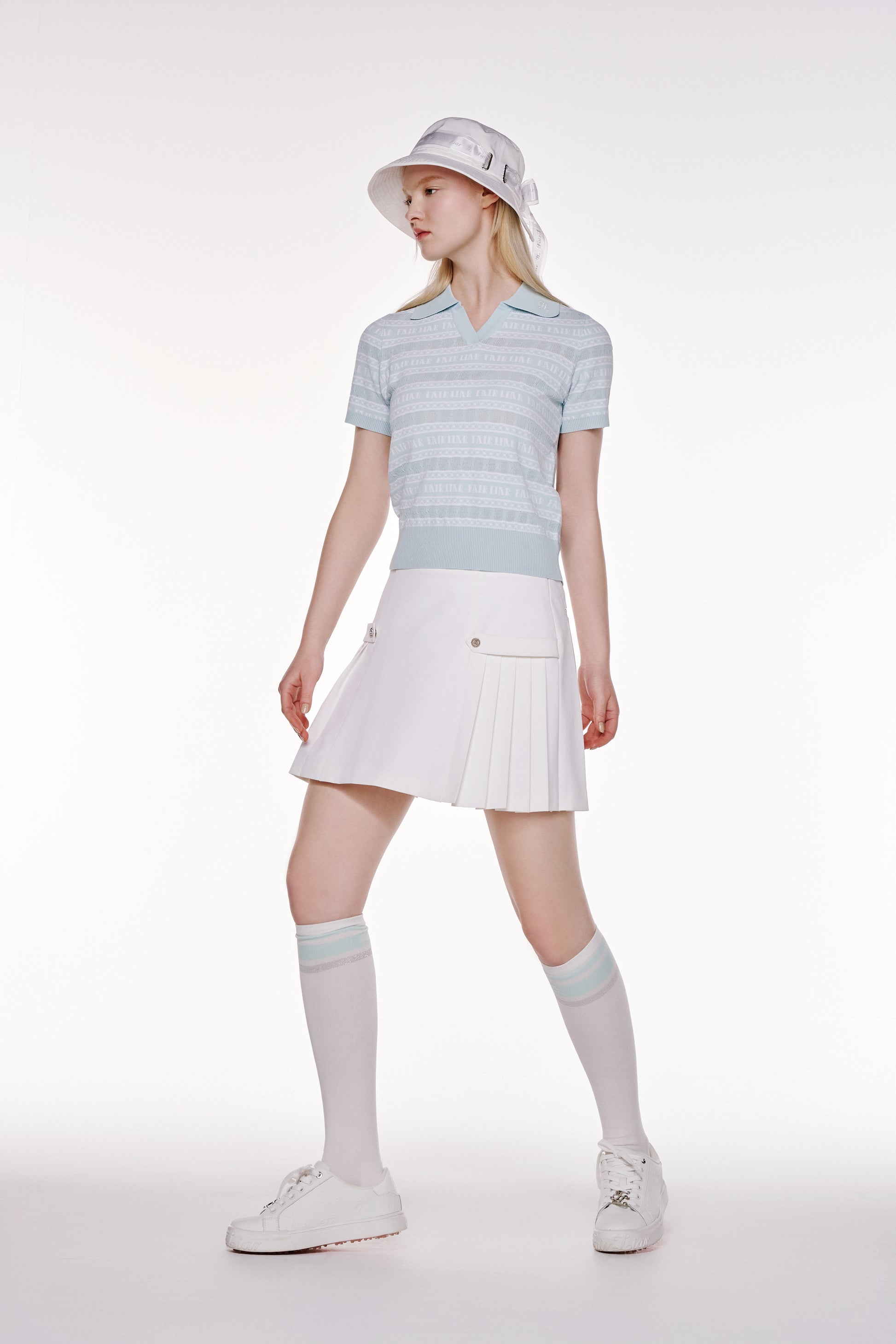 ロゴ入りジャカードとケーブル編みをミックスしたデザインが特徴のアイテムです。クロップド丈で、ハイウエストのボトムスやスカートと合わせることで、脚長効果を引き出します。