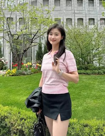 オープンVネック襟のクロップド丈セミルーズフィットニット。