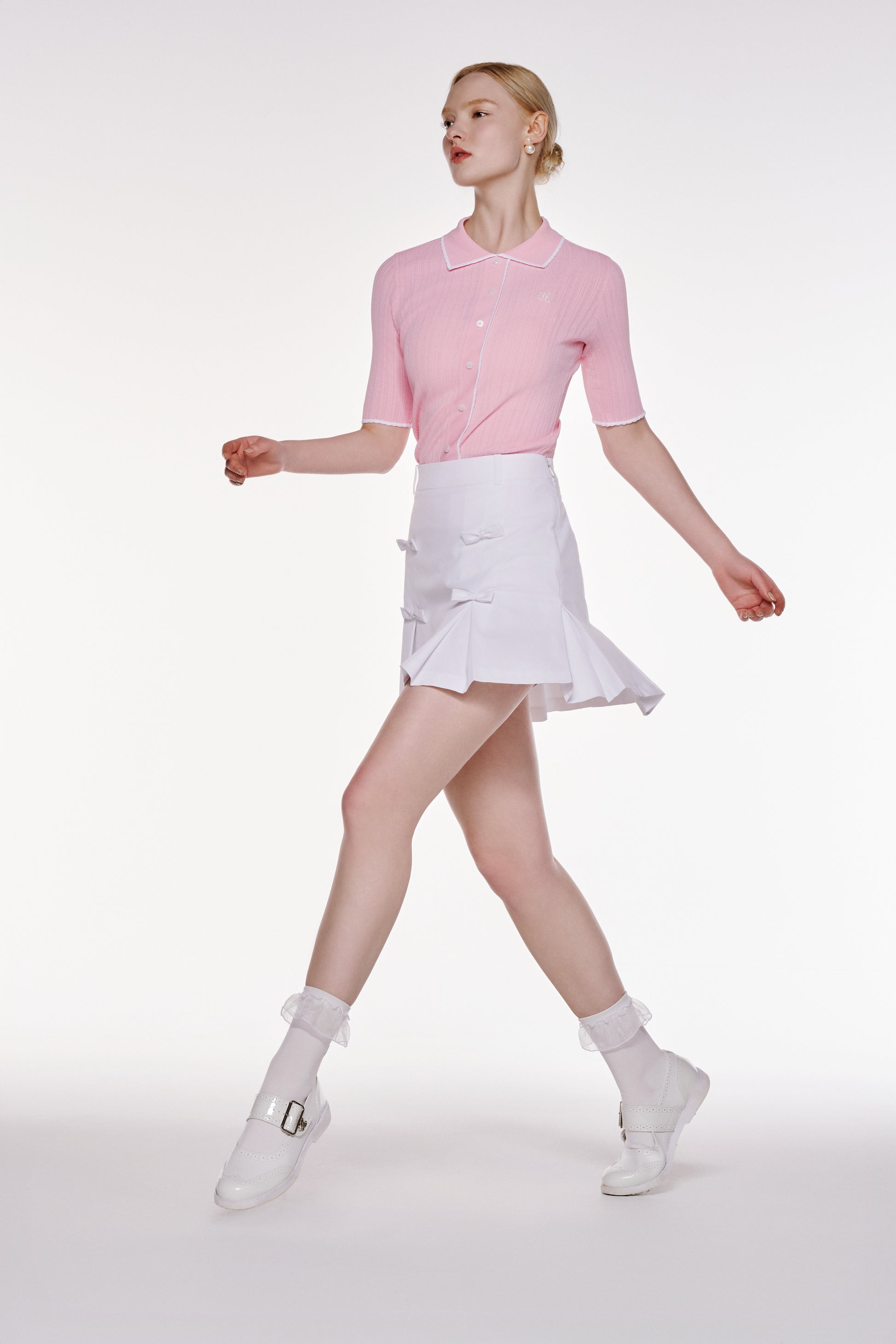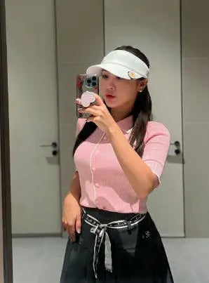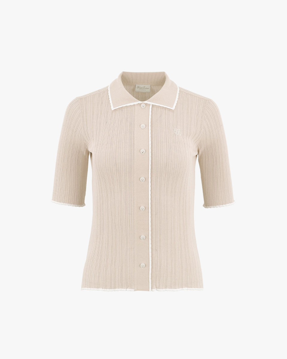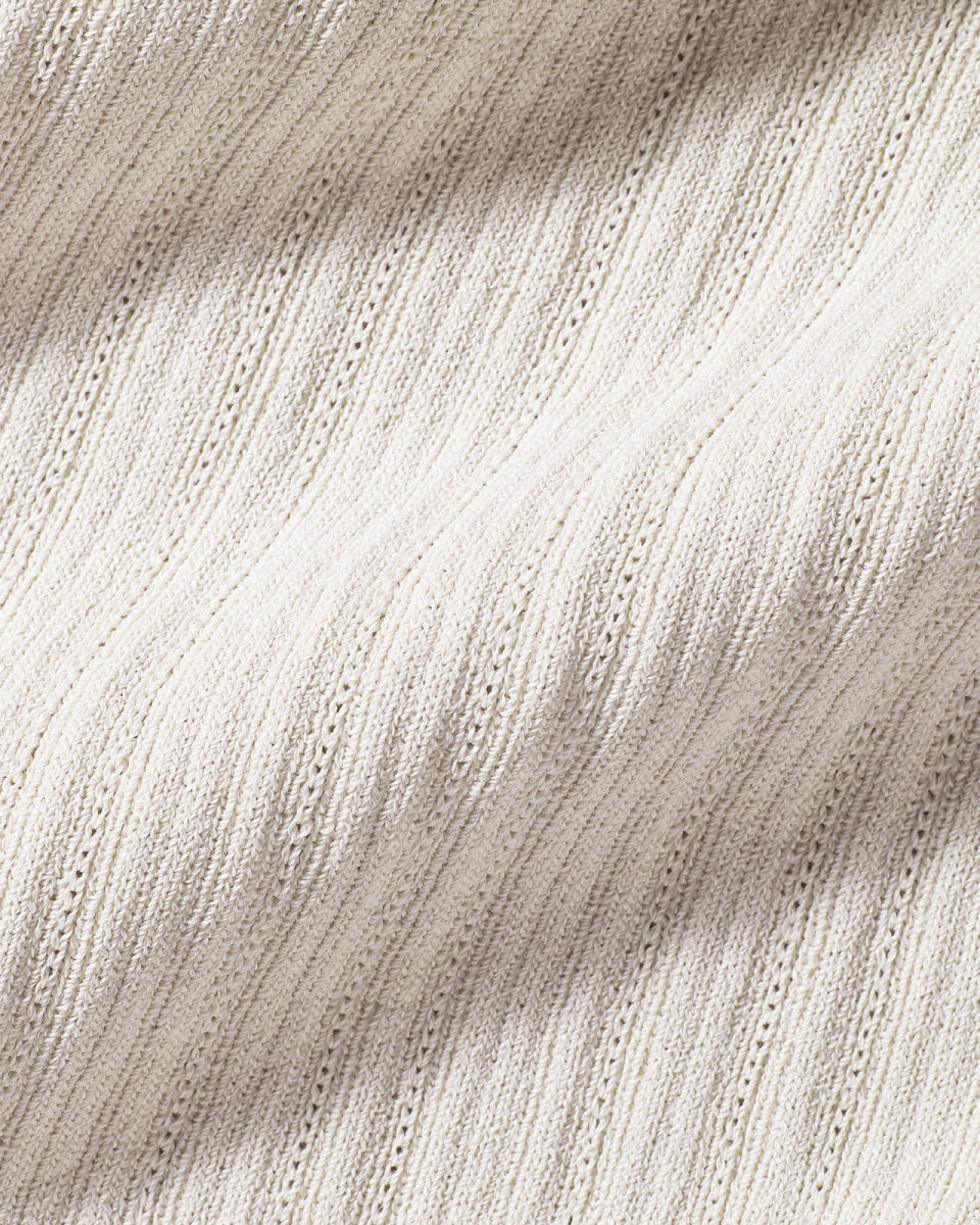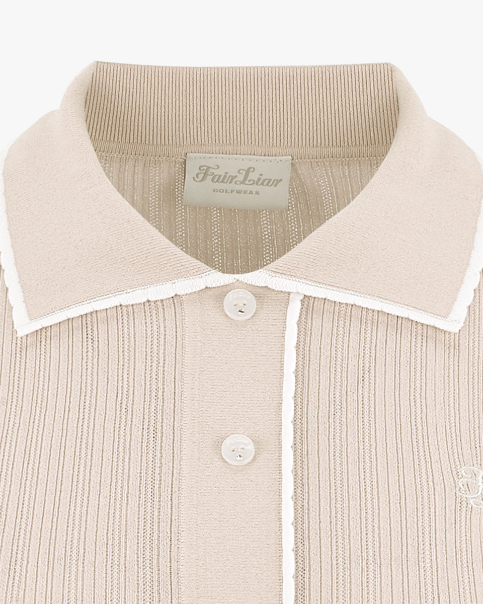 クールな触感と高い伸縮性を持つ機能性原糸を使用したアイテムです。エッジにはスカラップ装飾が施され、繊細なディテールが目を引きます。ロゴ入りのキュービックボタンがアクセントとなり、スタイリッシュでモダンな印象を演出します。